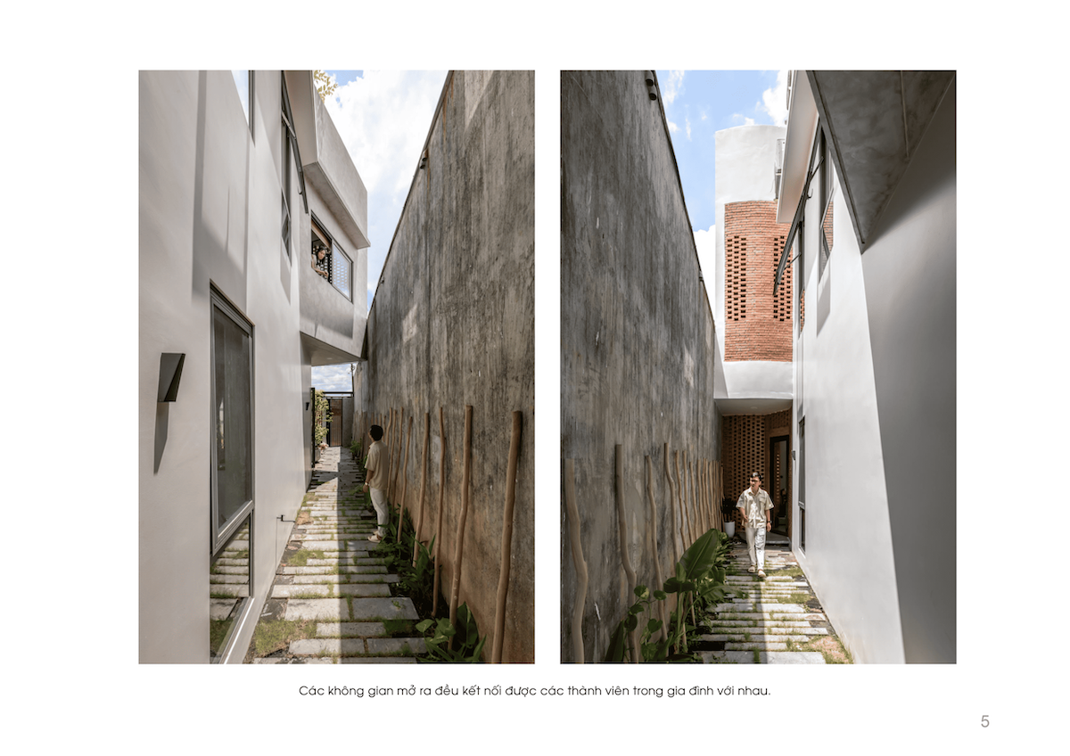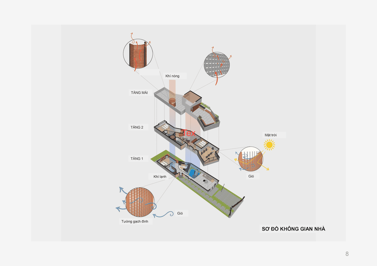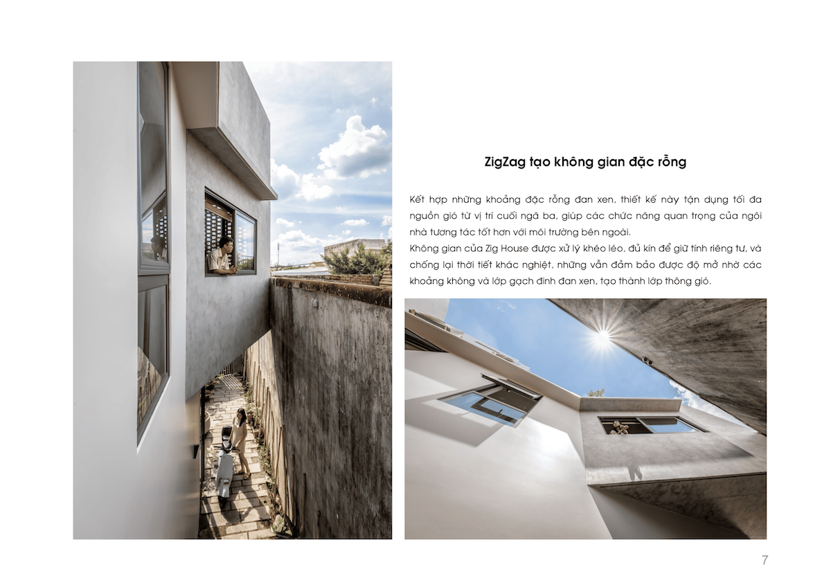 Thông qua sự đan xen giữa các khối đặc – rỗng, ngôi nhà tận dụng tối đa luồng gió từ vị trí ngã ba. Gió tự nhiên đi qua các khoảng đệm, len lỏi vào giếng trời trung tâm và thoát ra qua các ô gạch gió, tạo thành một vòng tuần hoàn đối lưu không khí. Nhờ đó, Zig House luôn mát mẻ, giảm thiểu sự phụ thuộc vào các thiết bị làm mát nhân tạo.