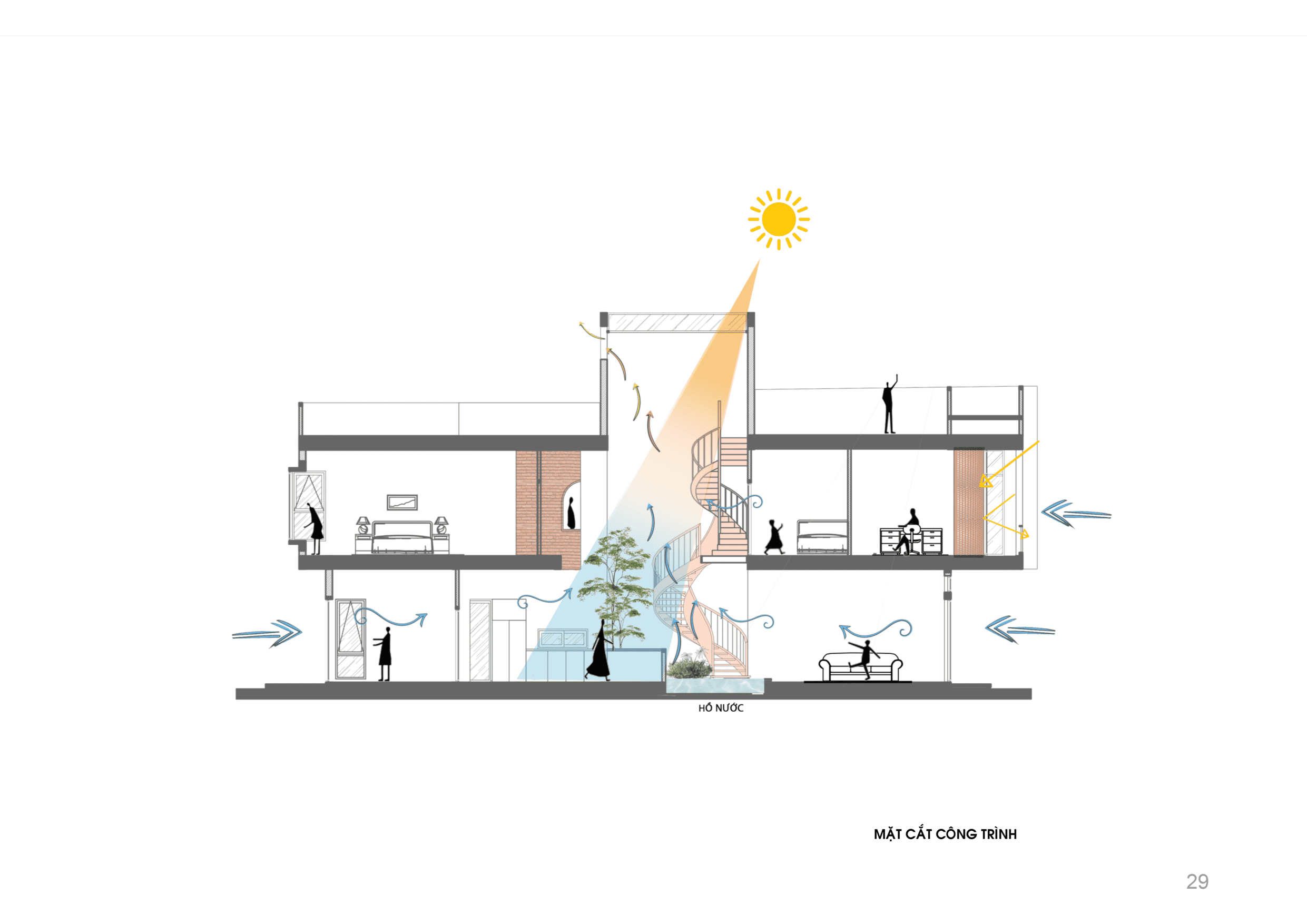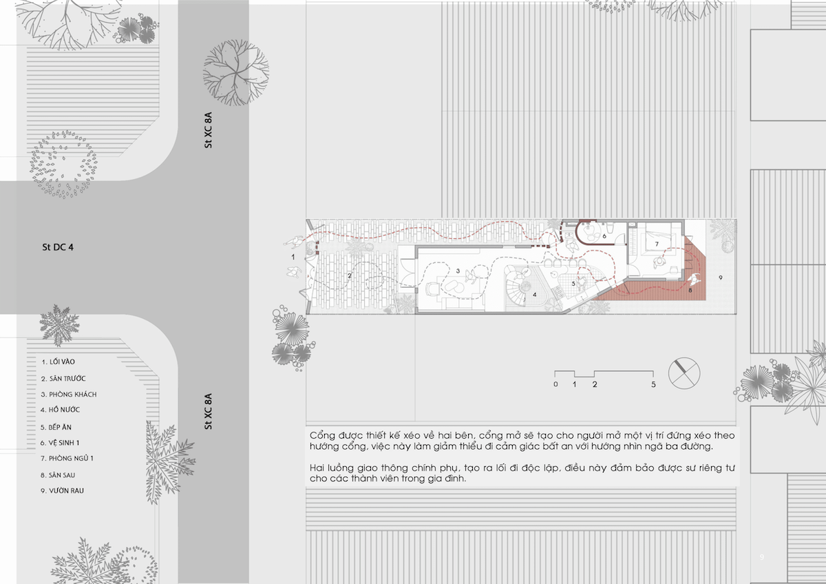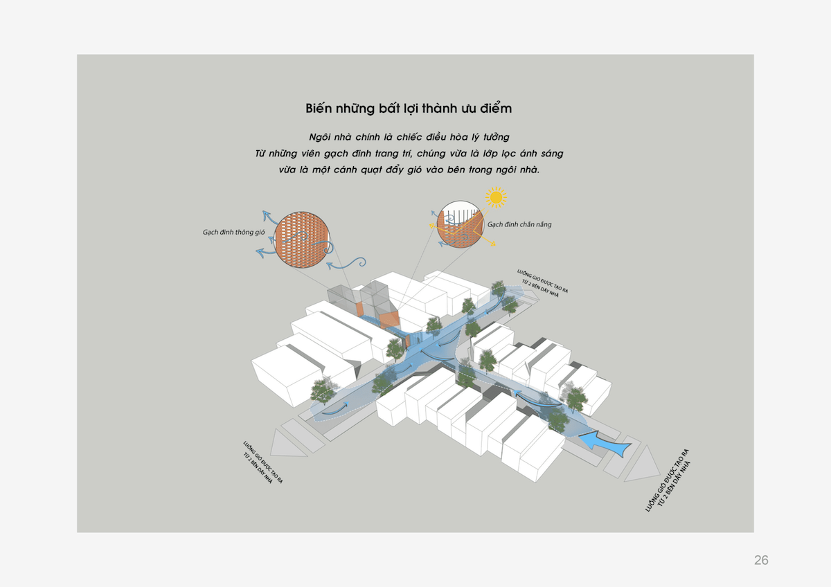 Thông qua sự đan xen giữa các khối đặc – rỗng, ngôi nhà tận dụng tối đa luồng gió từ vị trí ngã ba. Gió tự nhiên đi qua các khoảng đệm, len lỏi vào giếng trời trung tâm và thoát ra qua các ô gạch gió, tạo thành một vòng tuần hoàn đối lưu không khí. Nhờ đó, Zig House luôn mát mẻ, giảm thiểu sự phụ thuộc vào các thiết bị làm mát nhân tạo.