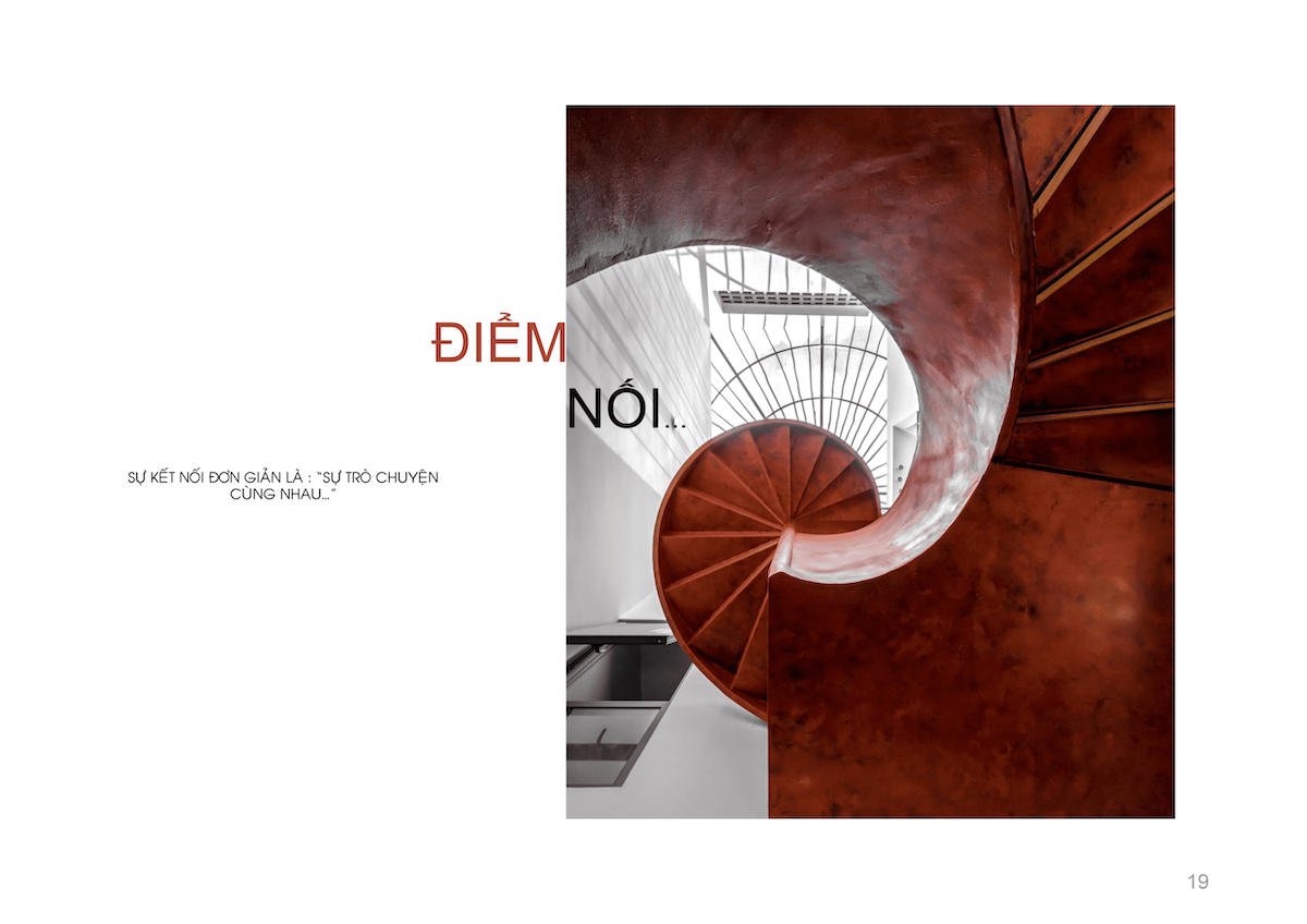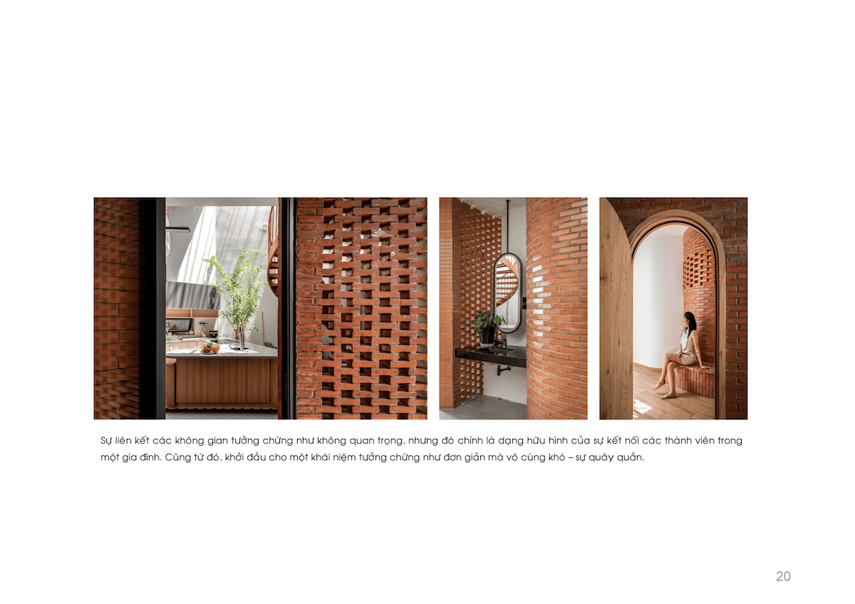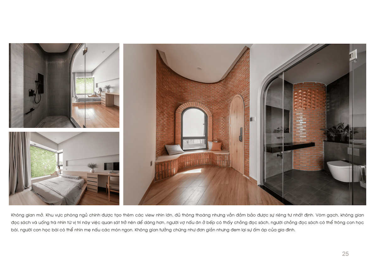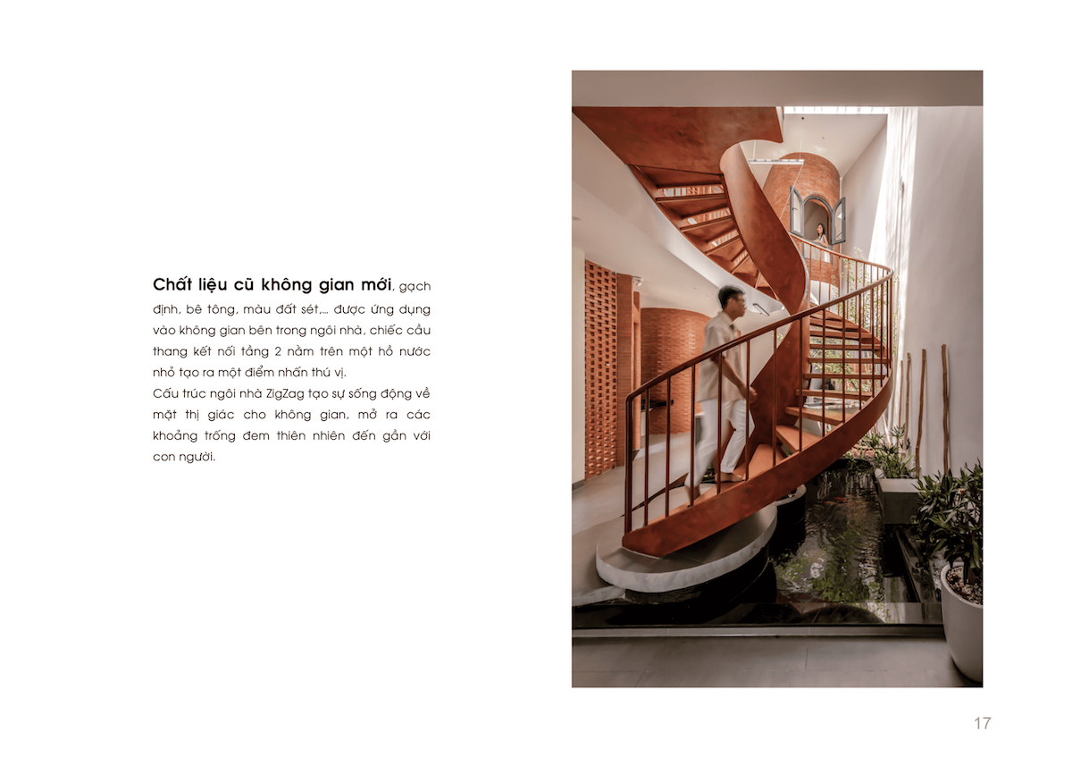 Không gian nội thất cũng được tổ chức nương theo đường nét ZigZag, giúp xóa tan cảm giác bất an về vị trí “mũi tàu”, thay vào đó là sự chuyển tiếp đóng – mở nhịp nhàng. Với triết lý “Chất liệu cũ, không gian mới”, sự kết hợp giữa gạch đinh, bê tông trần và hiệu ứng đất sét mang lại vẻ đẹp mộc mạc, gần gũi nhưng vẫn đầy hơi thở đương đại.
