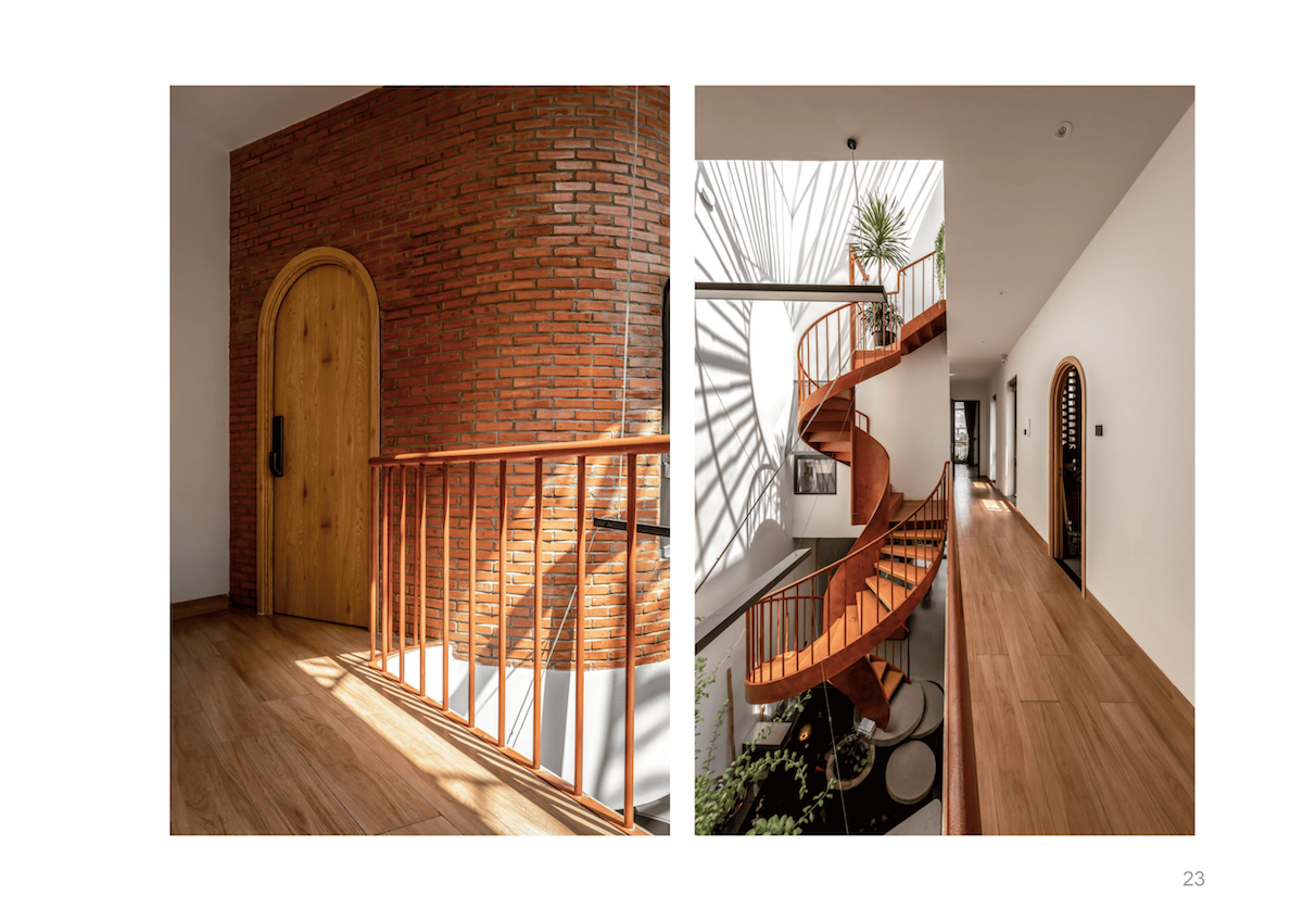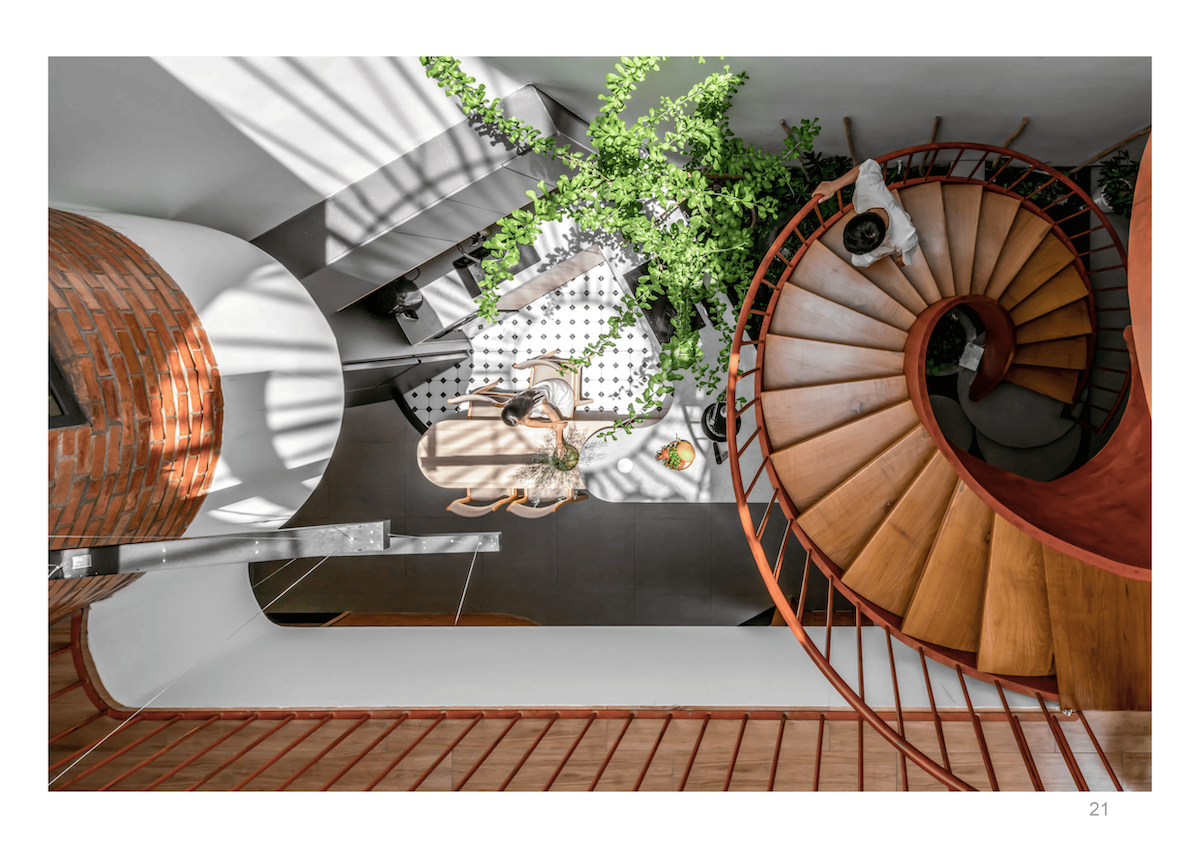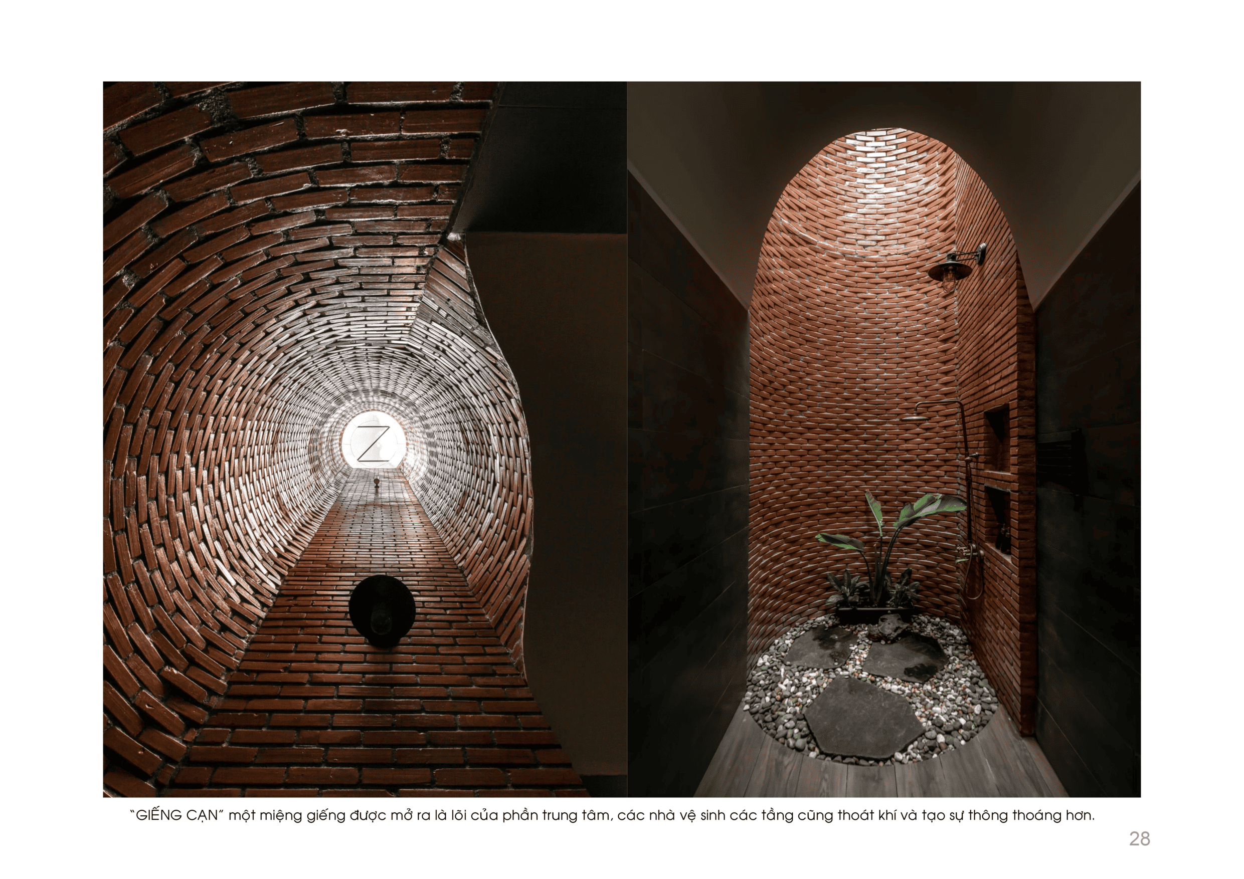Không gian nội thất cũng được tổ chức nương theo đường nét ZigZag, giúp xóa tan cảm giác bất an về vị trí “mũi tàu”, thay vào đó là sự chuyển tiếp đóng – mở nhịp nhàng. Với triết lý “Chất liệu cũ, không gian mới”, sự kết hợp giữa gạch đinh, bê tông trần và hiệu ứng đất sét mang lại vẻ đẹp mộc mạc, gần gũi nhưng vẫn đầy hơi thở đương đại.